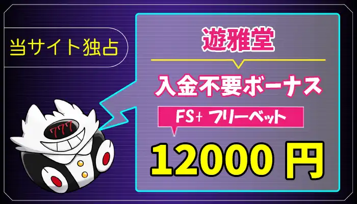 遊雅堂の入金不要ボーナスは、当サイト独占で総額12,000円分もらうことができます。業界一太っ腹な入金不要ボーナスを完全解説しています。